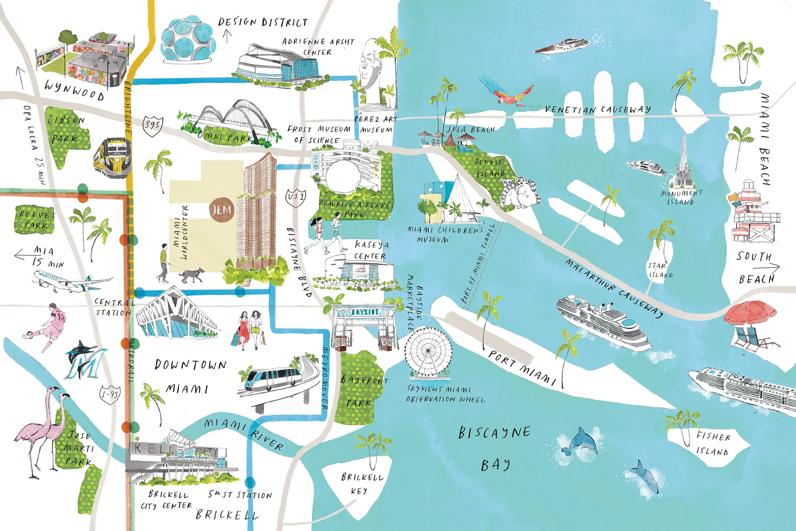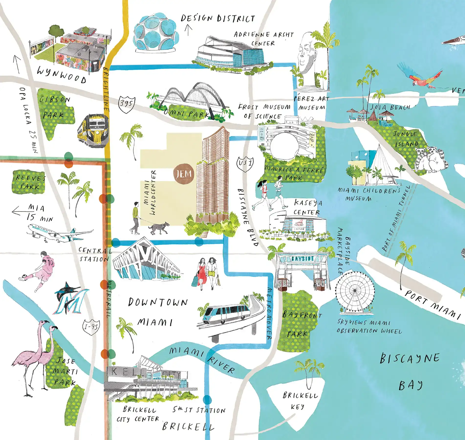 A solo pasos de Biscayne Bay, museos, restaurantes con estrellas Michelin, tiendas de lujo y el Brightline, JEM forma parte de Miami Worldcenter, el proyecto urbano más importante de la ciudad y uno de los de mayor plusvalía en Estados Unidos.
